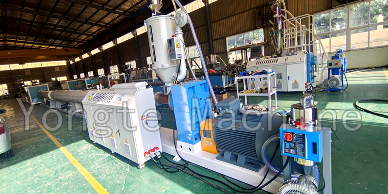 Η γραμμή παραγωγής σωλήνων Yongte 75-250mm PE υιοθετεί προηγμένη τεχνολογία και εξοπλισμό στη βιομηχανία για να εξασφαλίσει την παραγωγή σωλήνων PE υψηλής ποιότητας. Η γραμμή παραγωγής είναι εξοπλισμένη με έναν εξωθητήρα μονής απόδοσης υψηλής απόδοσης. Η βίδα υιοθετεί ένα φράγμα και δομή ανάμειξης της κεφαλής και το βαρέλι υιοθετεί ένα νέο βαρέλι με σχισμές, το οποίο βελτιώνει σημαντικά το φαινόμενο πλαστικοποίησης και ανάμιξης, καθιστώντας τον όγκο εξώθησης μεγαλύτερο και τη λειτουργία σταθερού.