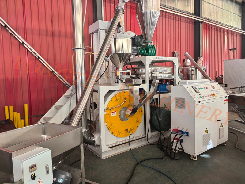 Όσον αφορά τις επιδόσεις, για να διασφαλίσει ποιότητα επαγγελματικής ποιότητας, η Yongte Plastics Machinery έχει αναβαθμίσει τρεις βασικές πτυχές. Στο άκρο τροφοδοσίας, προστίθεται μια μονάδα προπλαστικοποίησης που διαθέτει διπλούς κυλίνδρους διάτμησης και μια ψεκασμένη είσοδο μαλακτικού. Αυτό χρησιμοποιεί μηχανική διάτμηση στις 3.000-5.000 σ.α.λ., σε συνδυασμό με την ακριβή προσθήκη αποσκληρυντικού 1%-3%, για τη μείωση της σκληρότητας του καουτσούκ από το Shore A 60-70 στο Shore A 40-50, επιλύοντας ουσιαστικά την πρόκληση επεξεργασίας της υψηλής ελαστικότητας του καουτσούκ που καθιστά δύσκολο το τρίψιμο. Τα εξαρτήματα λείανσης του πυρήνα έχουν αναβαθμιστεί σε οδοντωτούς κυλίνδρους επικαλυμμένους με καρβίδιο βολφραμίου, με σκληρότητα HRC 70-75 και οκταπλάσια αύξηση στην αντοχή στη φθορά, αντέχοντας αποτελεσματικά την πρόσκρουση του υπολειμματικού χαλύβδινου σύρματος στο απόβλητο καουτσούκ. Το σύστημα ενσωματώνει επίσης έναν σχεδιασμό διπλού ελέγχου θερμοκρασίας που διαθέτει σπειροειδή υδρόψυκτο χιτώνιο και ακροφύσια ψύξης αέρα πολλαπλών κατευθύνσεων, εξασφαλίζοντας σταθερή θερμοκρασία θαλάμου λείανσης κάτω από 40°C και μειώνοντας σημαντικά το ποσοστό πρόσφυσης τοιχώματος σκόνης καουτσούκ από 30% σε λιγότερο από 5%. Επιπλέον, στο τέλος του συστήματος είναι ενσωματωμένος ένας ενσωματωμένος ταξινομητής αέρα και η γραμμή επιστροφής χονδροειδούς σκόνης. Η ρυθμιζόμενη ταχύτητα ταξινόμησης τροχών 3.000-10.000 σ.α.λ. επιτρέπει τον ακριβή έλεγχο της λεπτότητας του τελικού προϊόντος από 40-120 mesh, διατηρώντας σταθερή απόδοση πάνω από 95%.